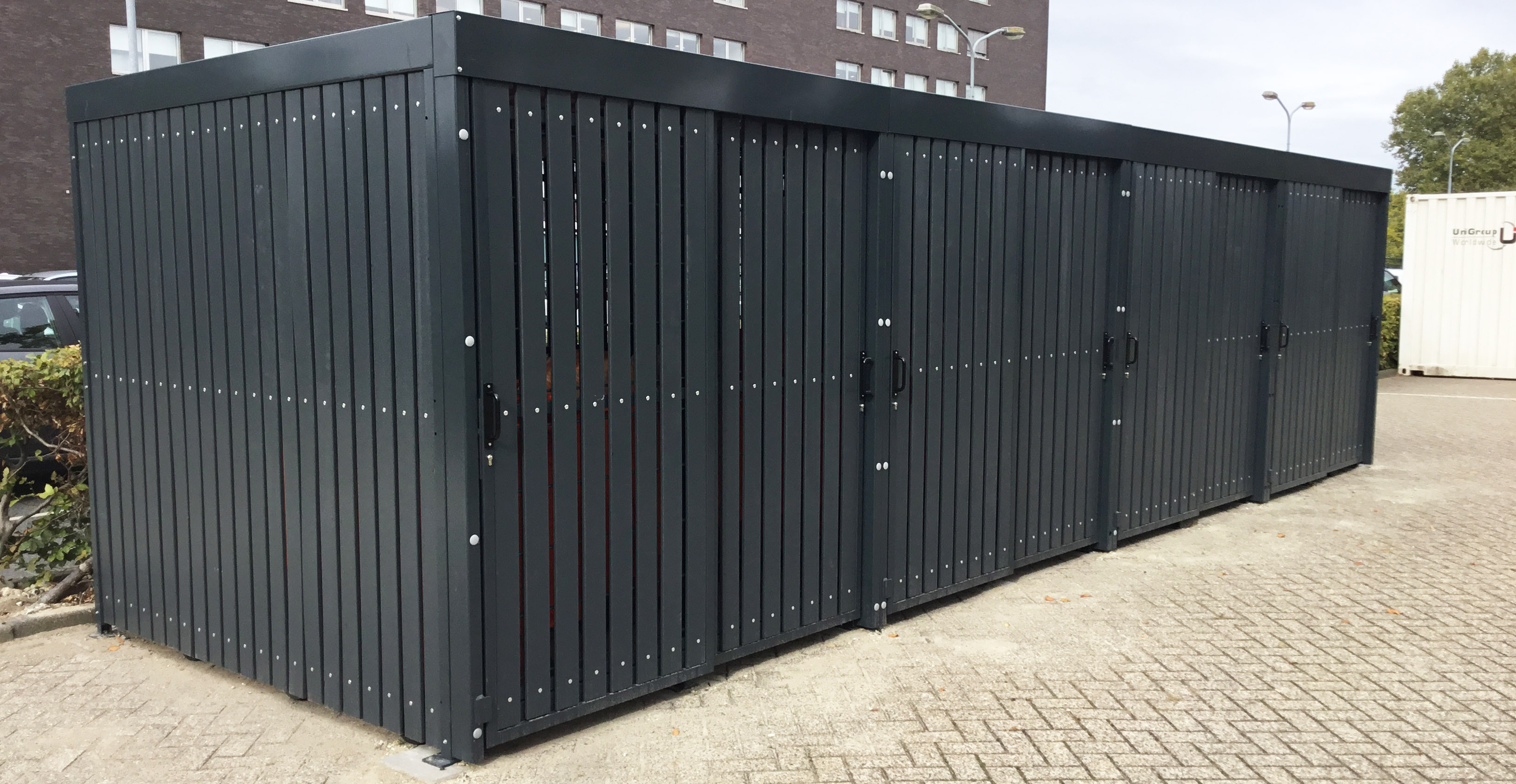 The FalcoLok bin store is a very versatile range of shelters providing a lockable secure store in a modular range and can be supplied in 2,500mm, 3,000mm, 5,000mm or 6,000mm modules, up to any size.